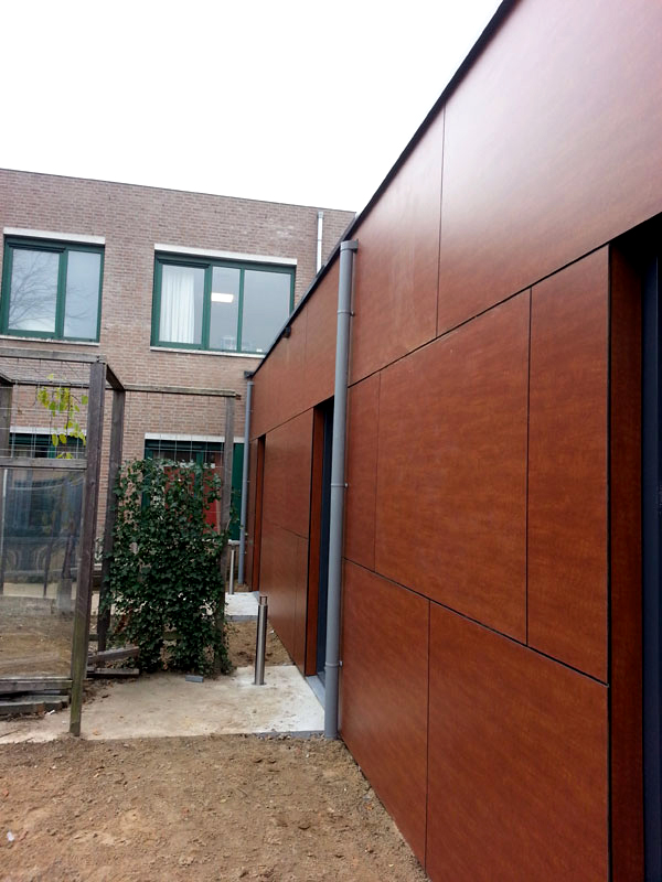 Gevelplaat Plastica NT gelijmd op houten achterconstructie.