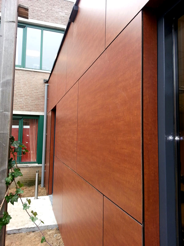 Gevelplaat Plastica NT gelijmd op houten achterconstructie.